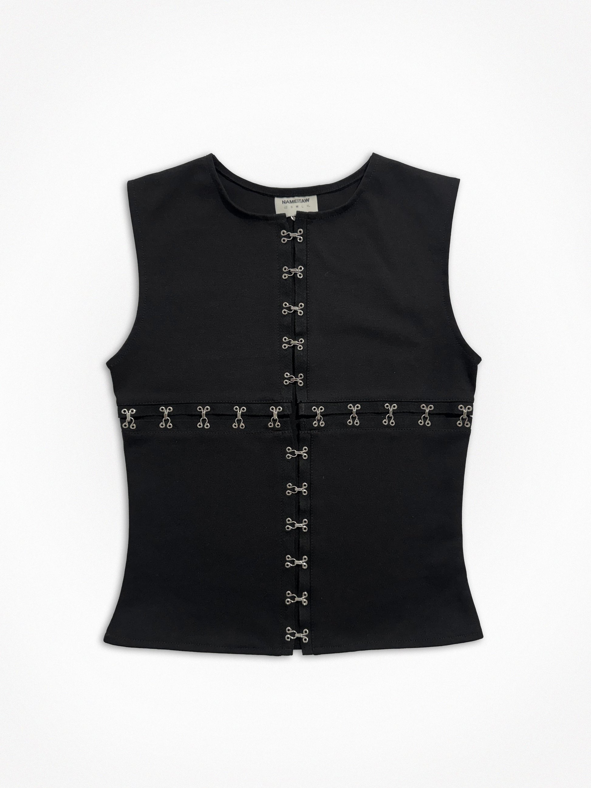 Hook and eye trim closure at center front and across chest