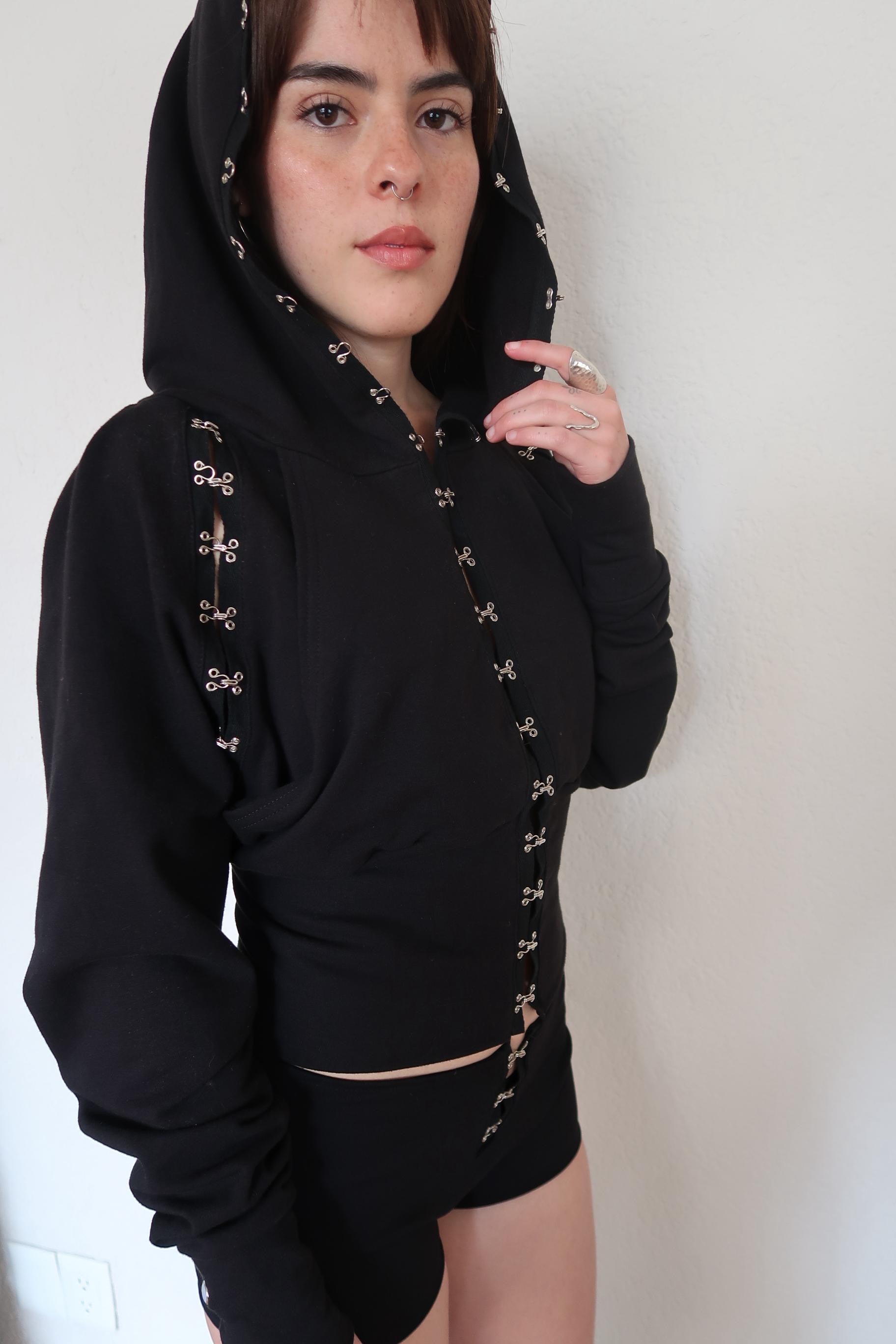 The hook and eye at sleeves turns hoodie into a vest - wrapped sleeves at back
